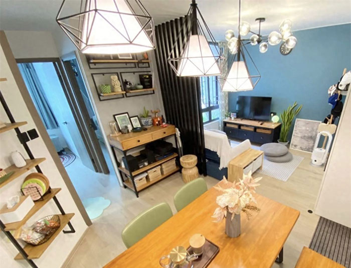 与此同时,餐桌的尺寸刚好合适,既留出了过道空间,又也=完全避开了家里的正门区域,个人感觉布置得还是挺用心的。