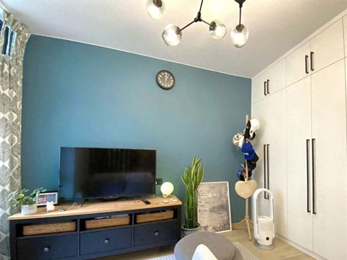 客厅的侧边,为了不浪费空间,还做了通顶的柜子,用来收纳一些日常杂物和衣服,尽可能将纵向空间充分利用起来,细节做得很不错。