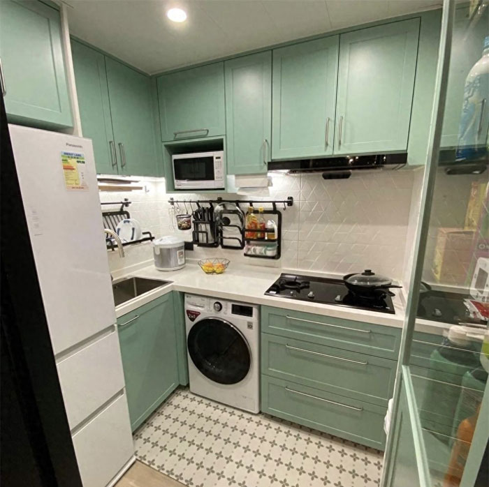 先来简单说一下厨房的空间,厨房内的空间很小,家里的木地板一直延伸到橱柜前方,直拼了花砖,更方便清洁打理,而L形的橱柜,也增加了碗碟餐具的收纳空间。