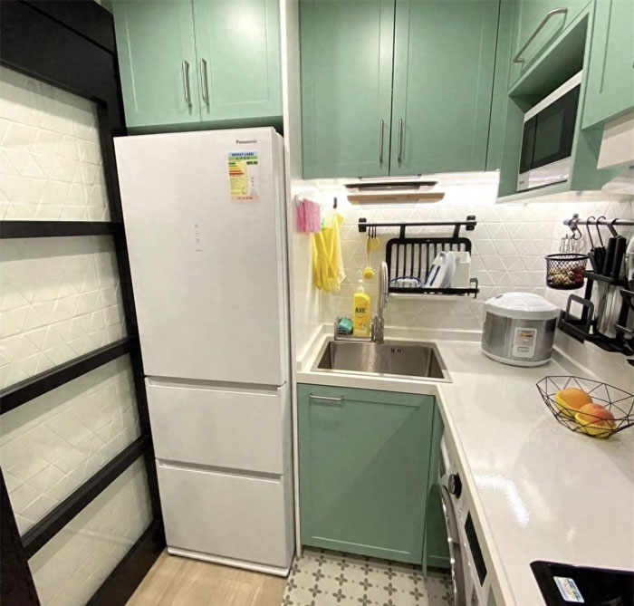 水槽紧挨冰箱,冰箱嵌入柜体,吊柜也恰到好处,这样一间小小的厨房,让我由衷地感到实用和漂亮,真的有些羡慕了~