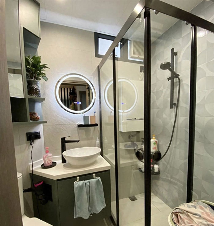 别看卫生界面积很小,还是不规则的户型,但也用玻璃浴室门做了干湿分区,沐浴后不会把水弄得卫生间到处都是,更方便清洁打理。