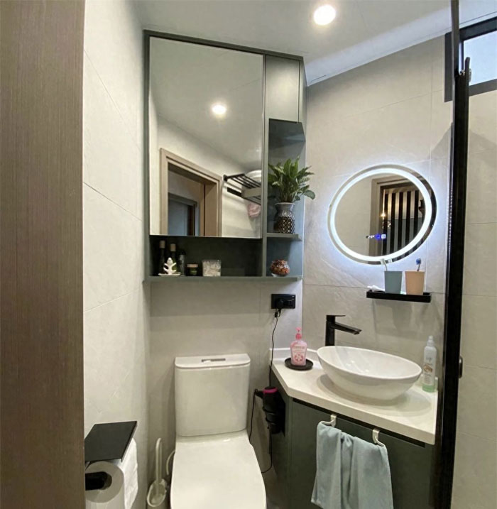 镜柜做到了马桶上方,洗手台也是按照户型格局定制的,尽可能将这种倾斜的角落空间也利用起来,且看上去更美观一些。
