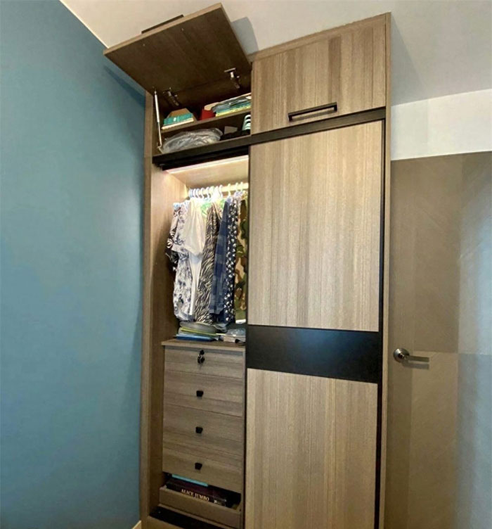 哦对,主卧内也有一组衣柜,用来收纳夫妻二人的衣物,实话说,要不是客厅也有一组大柜子,这组衣柜的收纳空间显然有些不够。