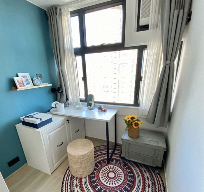 次卧室内目前只是简单装修了一下,当作妻子的梳妆台和游戏室,算是一个多功能区,后续应该会改成孩子的儿童房,放置上下铺的床来利用起纵向空间。